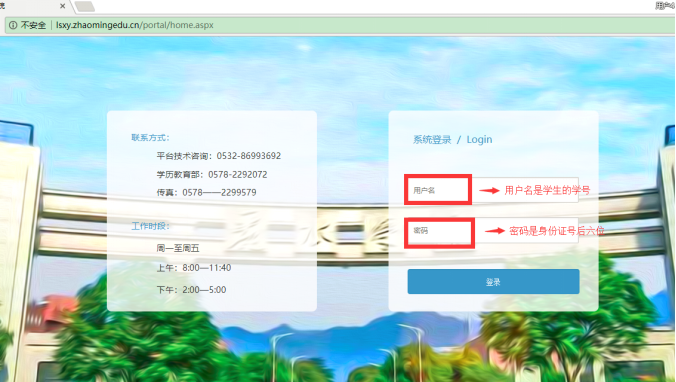 在电脑上登录网址http://lsxy.zhaomingedu.cn,在右侧系统登录框内输入账号和密码账号是学生的学号,密码是身份证后六位,输入完成后点击“登录”按钮进行登录。
