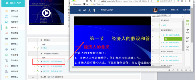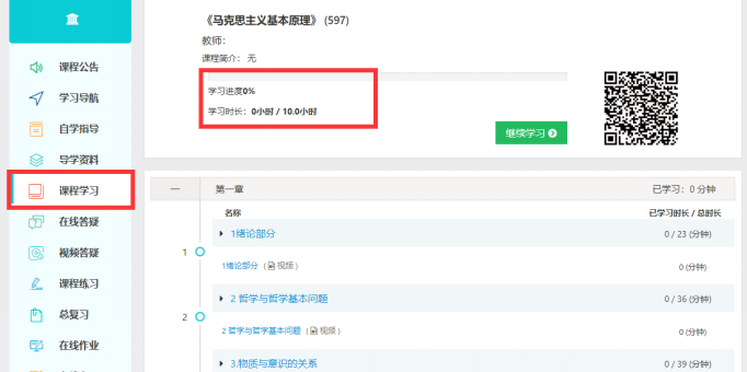 第一步:点击【课程学习】,进入到展示学习目录页面点击继续学习会回到上次学习结束的地方学生可在页面查看自己的学习进度和学习时长。