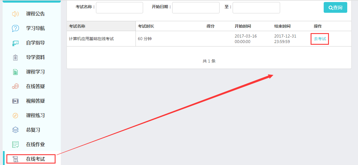 第一步:进入【在线考试】,点击“去考试”参加考试,可根据考试名称开始时间等进行考试信息查询