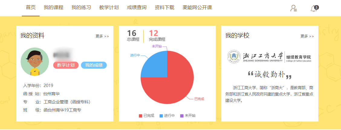 2、学员进入个人的学习平台后,即可点击我的课程、我的练习、资料下载等进行学习。