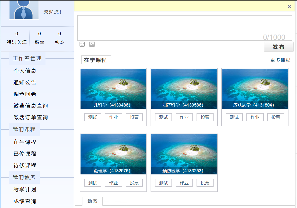 登录后,显示学生工作室,默认显示部分在学课程,如果有更多的课程可以点击更多课程或者直接点击我的课程下的在学课程进行查看;