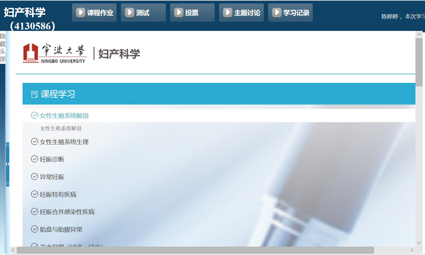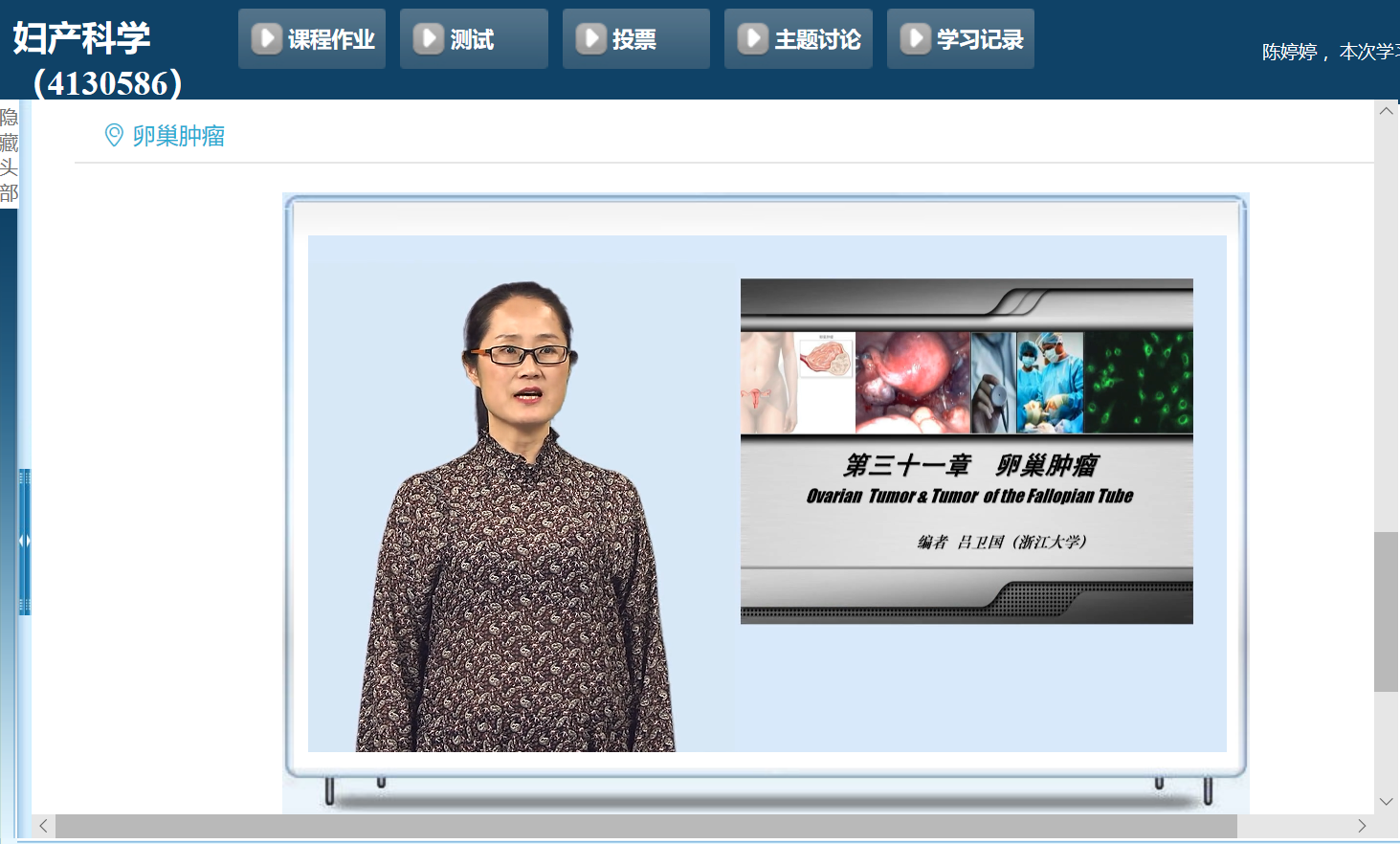 课件界面如图,可以进行课程作业、测试、投票、主题讨论和学习记录等操作;