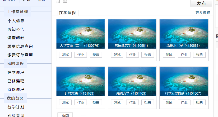 登录后,显示学生工作室,默认显示部分在学课程,如果有更多的课程可以点击更多课程或者直接点击我的课程下的在学课程进行查看;