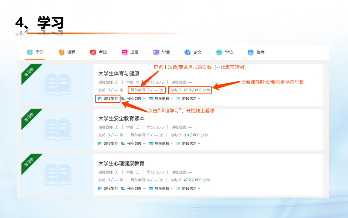 2、剩余课程大家有时间可以进入以下平台学习(仅供学生学习,该平台不计成绩):网址:http://student.hcxy.sccchina.net/;学生用户名:证件号,学生初始密码:出生日期8位。