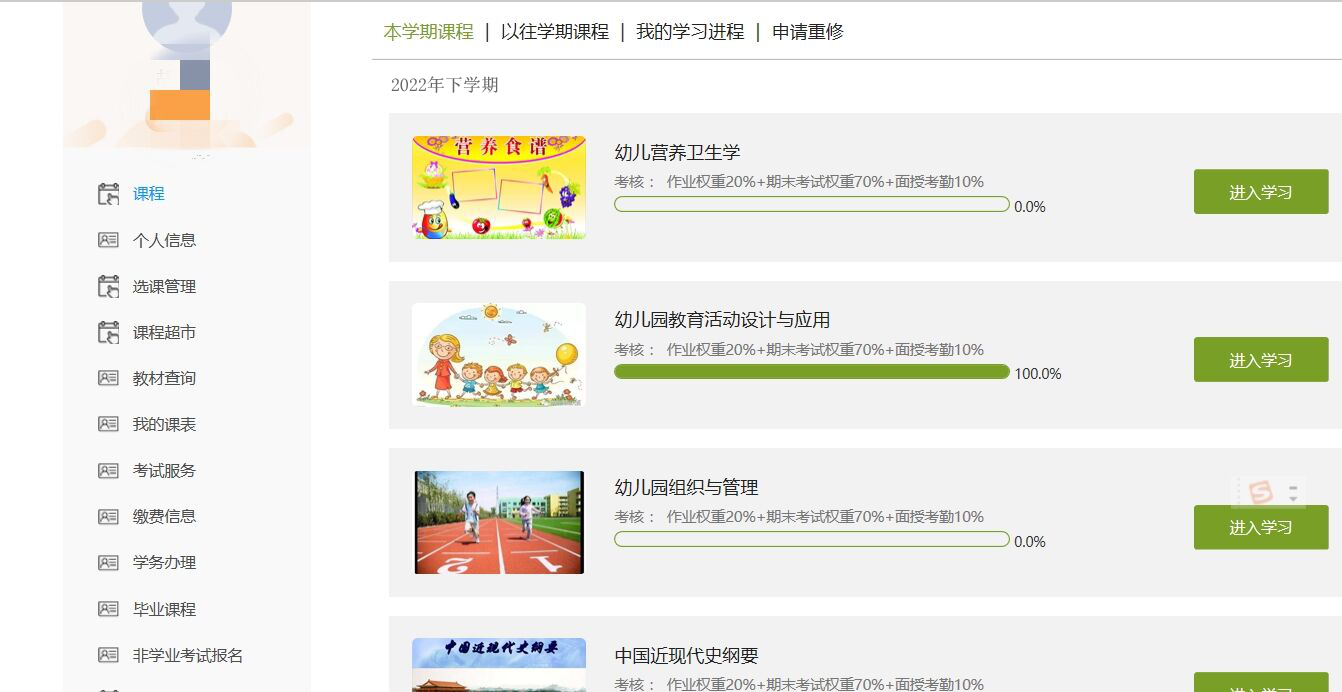 三、登录后:显示本学期的课件,点击进入学习,学员听课时请注意将所有课程都要听完,否则即使听了显示还是未听。具体如图(1)图(2)