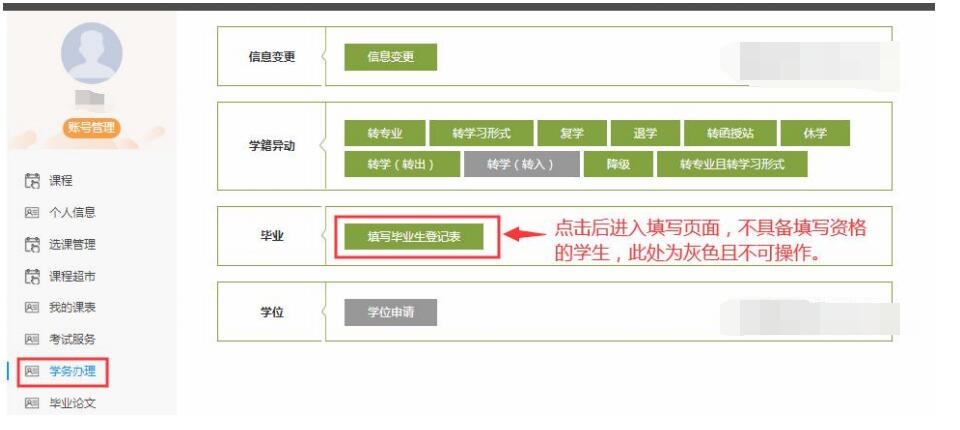 请登录“嘉兴学院终身教育在线”平台学生个人空间,点击“学务办理”里“毕业”栏内的“填写毕业生登记表”。界面如下: