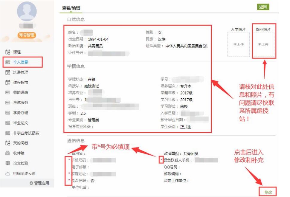 个人信息核对和补充页面如下:点击各数据区右下角“修改”键,进行信息补充填写。
