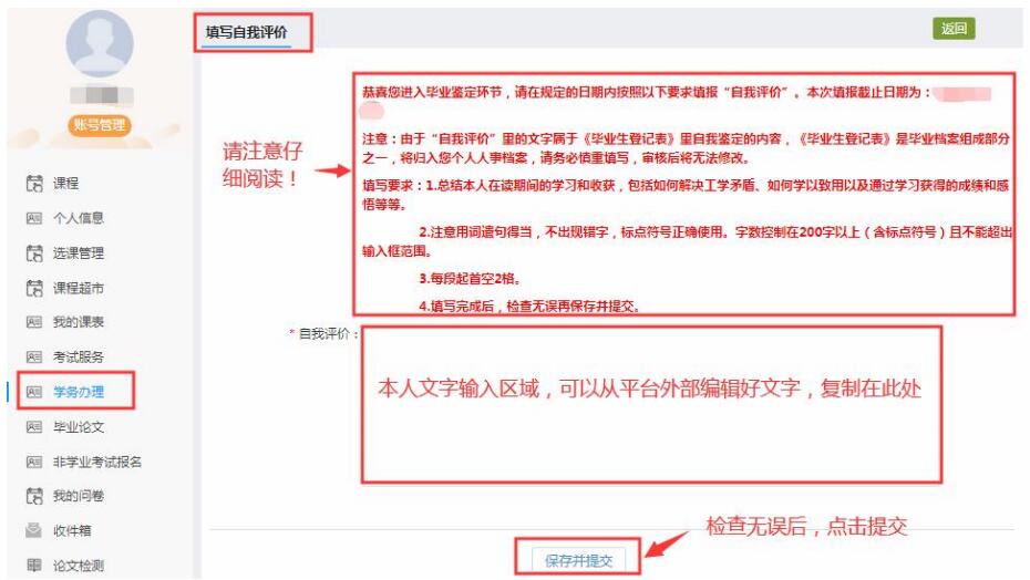 完成个人信息补充后,重新进入“学务办理”里“毕业”栏内的“填写毕业生登记表”,填写“自我评价”。填写前务必注意浏览填写区域上方的红色文字说明,建议在平台之外先打草稿,修改完成后复制在此处,检查无误再保存和提交。
