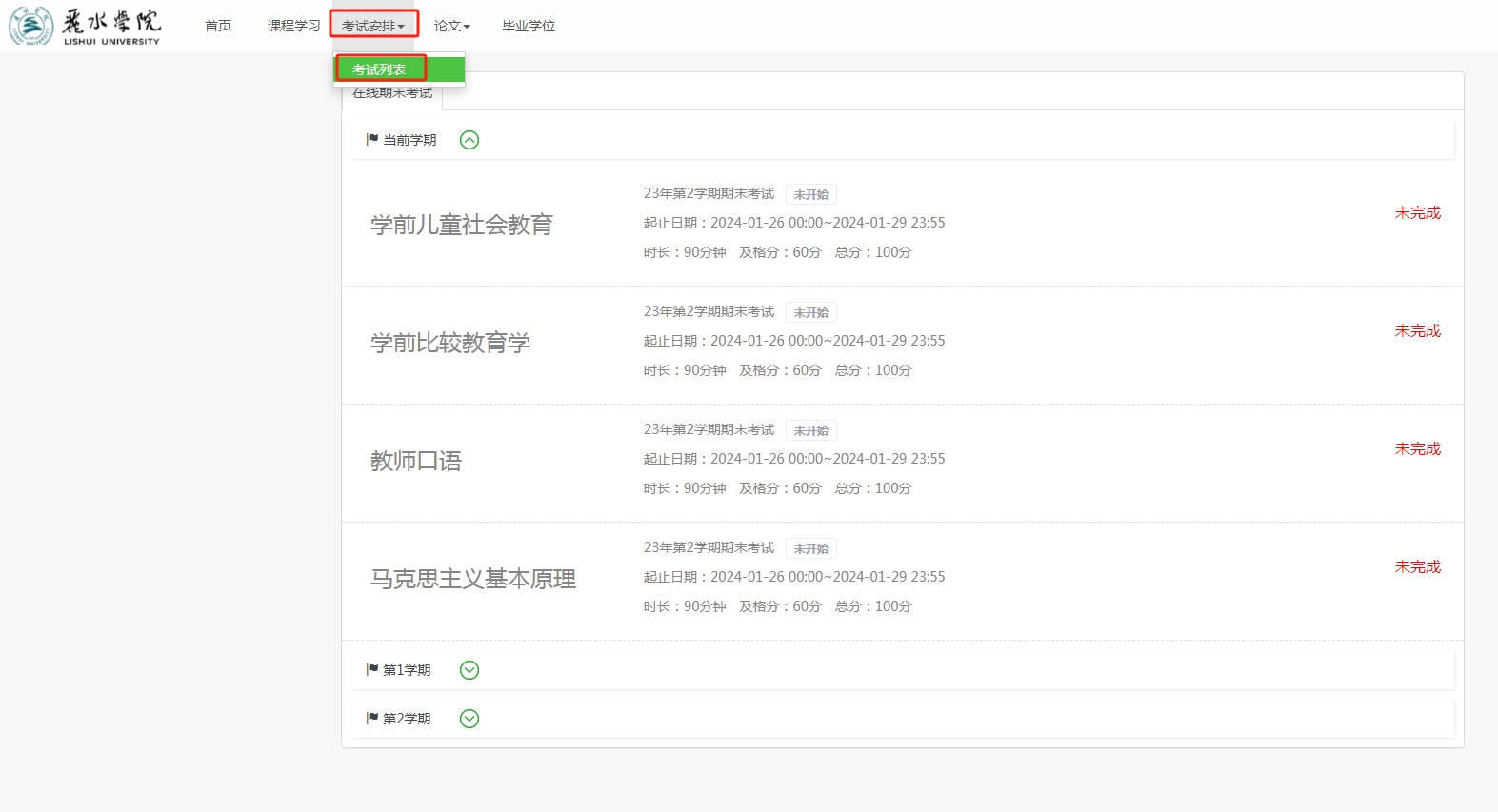 二、机考功能所在位置:点击考试安排→考试列表→当前学期,如下图: