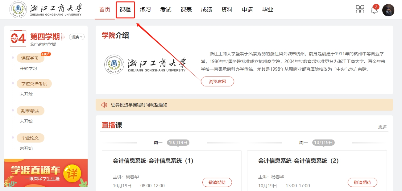 根据浙江江工商大学高等学历教育2023级(第四学期)直播课程的通知,为方便学员学习和解决工学矛盾,学校开发了基于互联网的继续教育网上学习平台,通过互联网在线学习相关课程内容。现将直播课程有关事项通知如下: