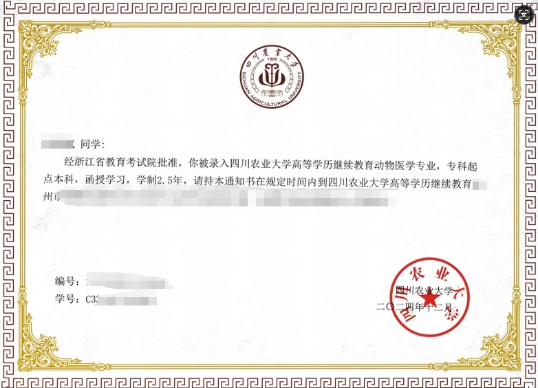 祝贺你!经浙江省教育考试院批准,你已被四川农业大学录取为高等学历继续教育2025级新生。你收到《录取通知书》,只表明取得了入学资格,新生必须报到并缴费,经四川农业大学继续教育学院入学资格复查合格,并经教育部学信网上新生学籍电子注册才取得正式学籍。如你在规定时间内学完所读专业人才培养方案规定的全部课程,成绩合格,颁发四川农业大学成人高等教育毕业证书,毕业证书进行学信网电子注册,国家承认学历,并享受与普通高校同等学历毕业生待遇,可报考专业技术职务、公务员及研究生等(具体以当年当地政策为准)。为做好 2025年新生报到入学工作,现将有关事项通知如下: