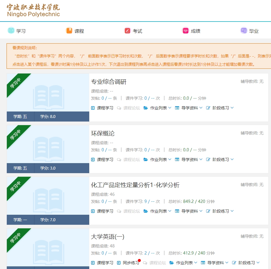 宁波职业技术学院高等学历继续教育2023级第五学期上学期开课了,为方便学员学习和解决工学矛盾,学校开发了基于互联网的继续教育网上学习平台,学员可以按照每学期的教学进程通过互联网在线学习相关课程内容。现将网上学习平台有关事项通知如下: