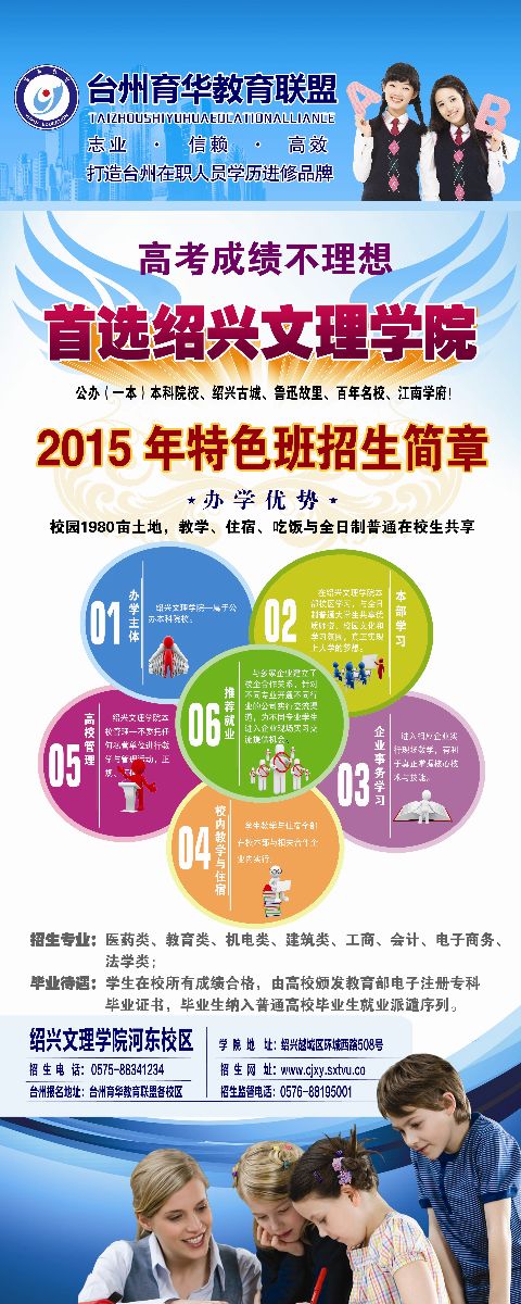 请不要气馁,一次考试的失利只能代表过去,求学之路就在你们脚下。 为使高考成绩不理想的学子重圆大学梦,有继续求学的机会。我校联合江苏九州职业技术学院,绍兴文理学院(公办一本)等高校面向台州参加高考的考生能够上正规国家计划内统招文凭。(说明:读书时间与统招生一致,专科三年,只是迟一年拿文凭)。凡经录取的学生,享受与统招生同等的教育条件,毕业证书与统招生一样,颁发全日制普通高校大专文凭,有报到证、三方就业协议书,学生学籍上中国高等教育学生信息网,可参加公务员、事业单位等考试。