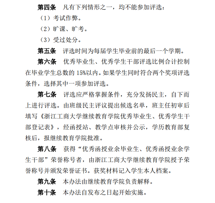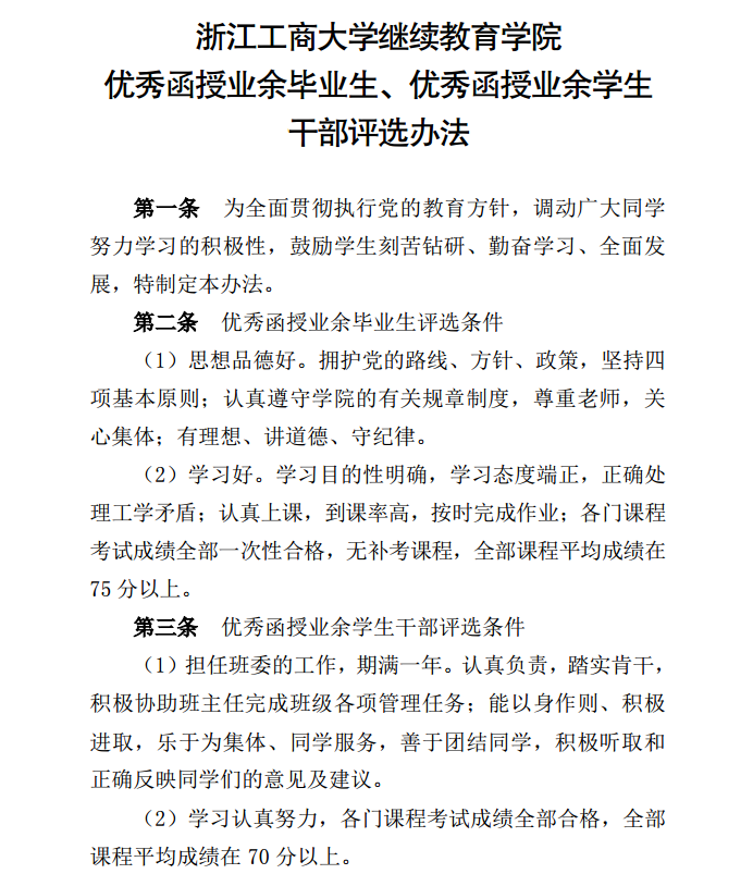 浙江工商大学继续教育学院,优秀函授业余毕业生、优秀函授业余学生,干部评选办法