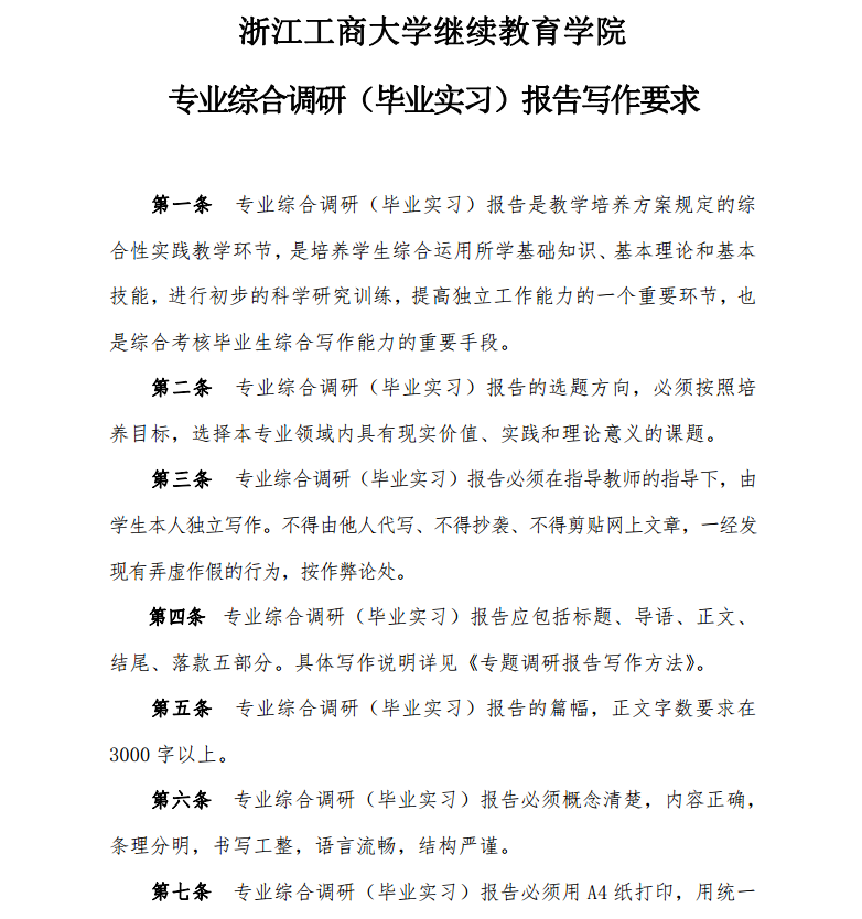 浙江工商大学继续教育学院 专业综合调研(毕业实习)报告写作要求