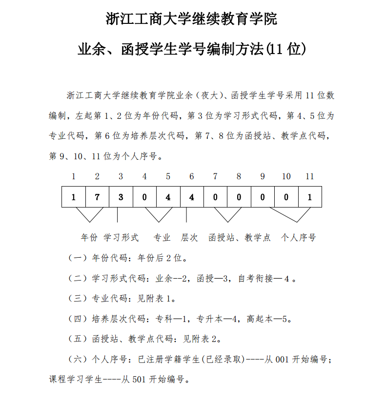 浙江工商大学继续教育学院 业余、函授学生学号编制方法(11 位)