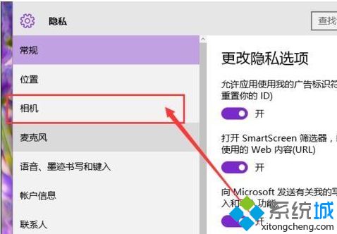 3、进入系统中的隐私设置选项以后,我们点击页面左侧的“相机 ”选项,然后开始设置系统中的相机应用;