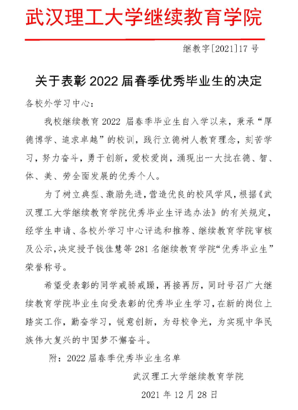 祝贺我校陈银建等三位学员被武汉理工大学继续教育学院评为2022届春季优秀毕业生