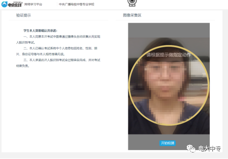 3.进入人脸识别阶段,请认真阅读“学生承诺”,将摄像头调整好或调整坐姿使脸部出现在拍摄区域内,点击“开始检测”。