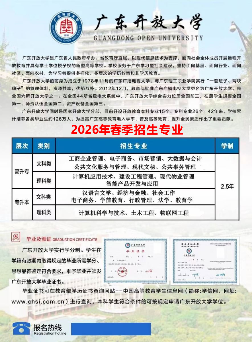 广东开放大学是以现代信息技术为支撑,面向社会全体成员开展开放教育并具有学士学位授予权的省属正厅级本科新型高校。学校前身是创建于1978年的广东广播电视大学,1988年创办广东广播电视大学附属中等职业技术学校,2005年创办广东理工职业学院,2010年纳入国家“探索开放大学建设模式”教育体制改革试点,2012年更为现名,2019年获批广东老年大学,2021年入选广东高等教育“强特色”建设高校和省域高水平高职院校建设计划建设单位,2022年与广东省理工职业技术学校实施“集团办学”。学校是广东终身教育学分银行、广东省1+X证书制度试点工作办公室落户单位,获批为广东省博士工作站,是省依法治校示范校、省绿色学校。