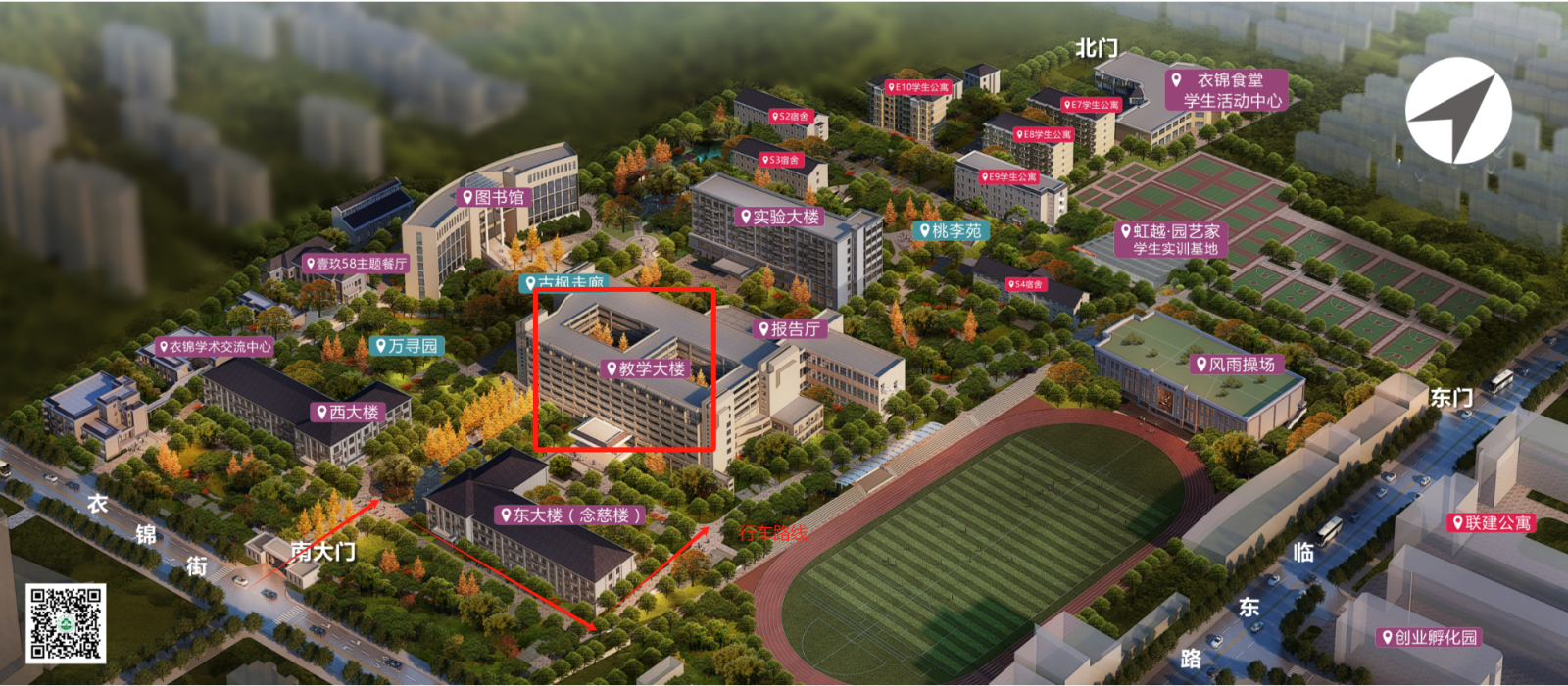 浙江省杭州市临安区锦城街道衣锦街252号,浙江农林大学衣锦校区(从衣锦街南大门入口到教学大楼,如下图)。