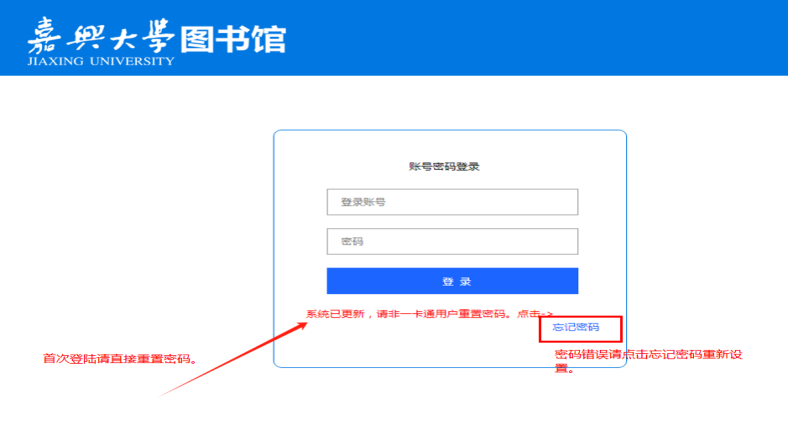第一步:输入嘉兴大学图书馆网址:https://vpnblib.zjxu.edu.cn:8080/loginPage,首次登陆请重置密码,账号为学号,如下图: