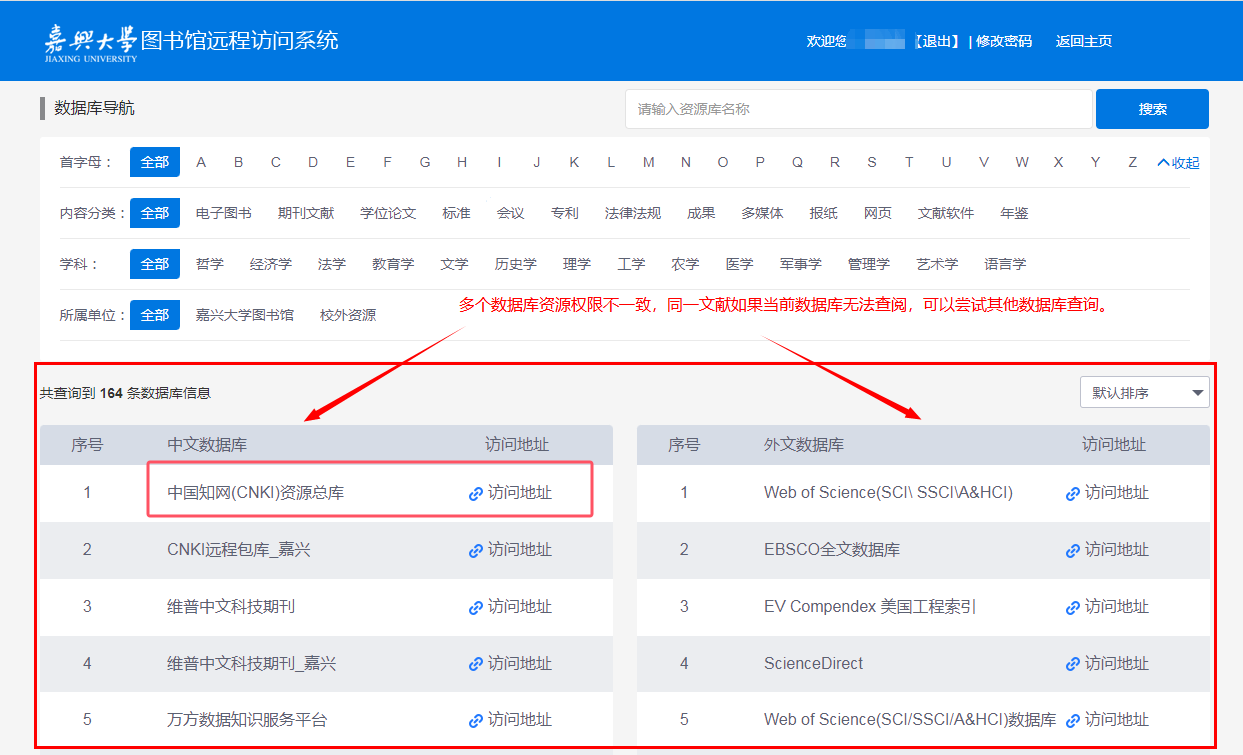 因校图书馆系统更新,学生首次进入都需重置密码,重置密码后登陆账号为学号,若非首次登陆密码错误,请点击“忘记密码”重设,切勿多次尝试,会被归为系统黑名单。登陆后选择任意数据库查找文献资料,由于各个数据库资源不一,若当前数据库所搜文献无权查看,请切换其他数据库查看。