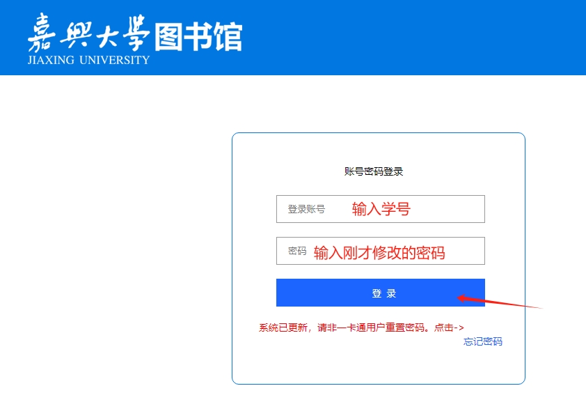 第五步:密码修改完成后,自动跳转回登录页面,输入学号和修改好的密码,如下图: