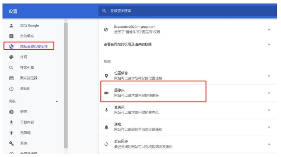 (1)第一种设置摄像头的方法:浏览器【设置】【隐私位置和安 全性】【网站设置】进行调整,全部选“允许”后方可进行后一步,“权 限”页中的红框中的“摄像头”从“禁止”调整成“允许”。