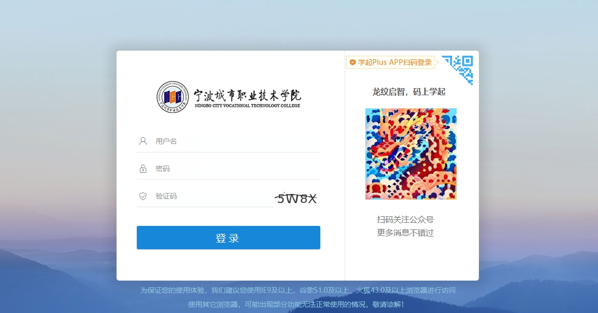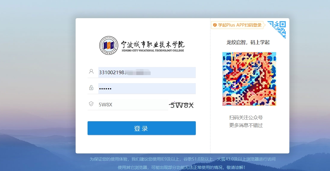 2、选择学校“宁波城市职业技术学院”,输入身份证号码,密码为身份证后6位,如下图: