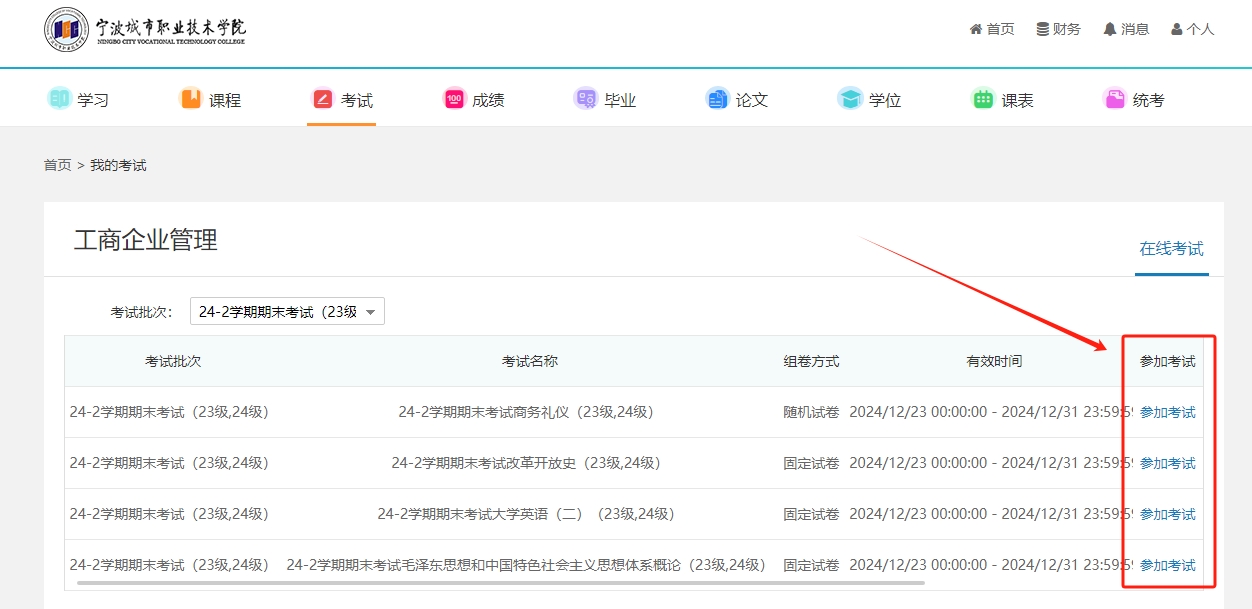 宁波城市职业技术学院高等学历教育2024级第三学期期末考试(在线机考)安排表