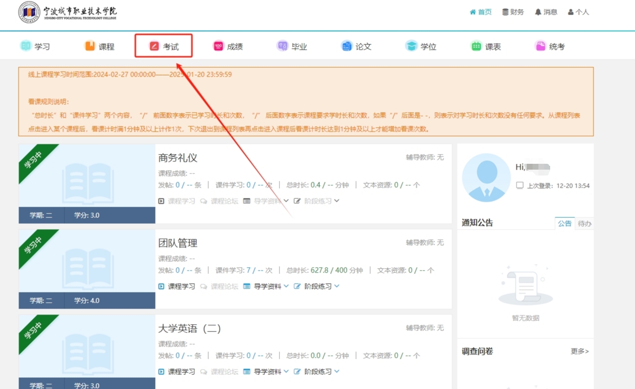3、登录学习平台,点击“考试”专栏,如下图:
