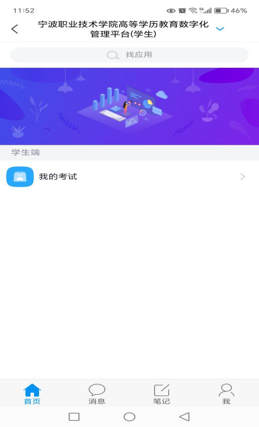 4、点击“首页”切换“宁波职业技术学院高等学历教育数字化管理平台(学生)”,点击“我的考试”,考试列表里选题相应的考试科目,进行考试即可。